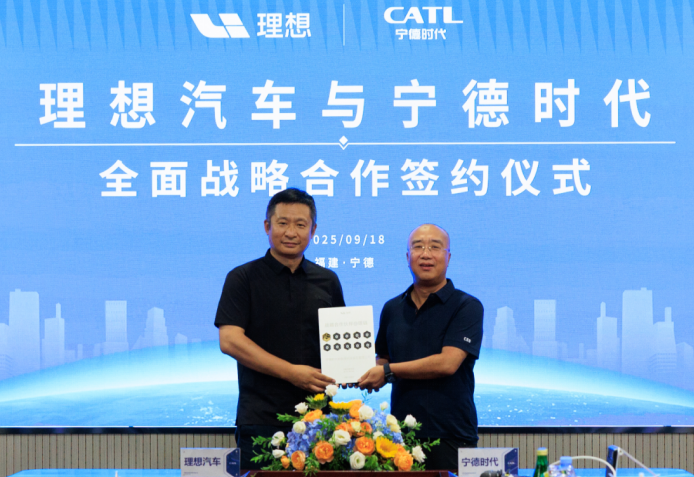 9月18日,理想汽车与宁德时代签署五年全面战略合作协议并完成授牌仪式。理想汽车供应链副总裁孟庆鹏、宁德时代国内乘用车副总裁王慧代表双方在宁德签署协议。