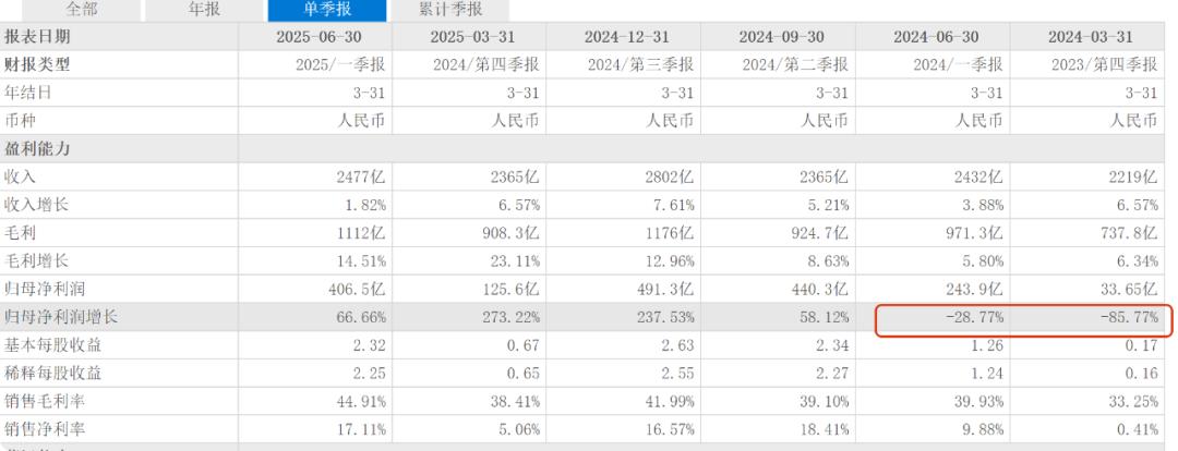 据阿里公开发布的财报显示,2023年第四季度,阿里净利润为33.65亿元,同比下滑85.77%。2024年一季度净利润243.9亿元,同比下滑28.77%。高鑫零售减值、优酷商誉减值等因素加剧亏损,或导致阿里净利润下滑,在随后几个季度中阿里净利润稳中向好,已经稳住基本盘。