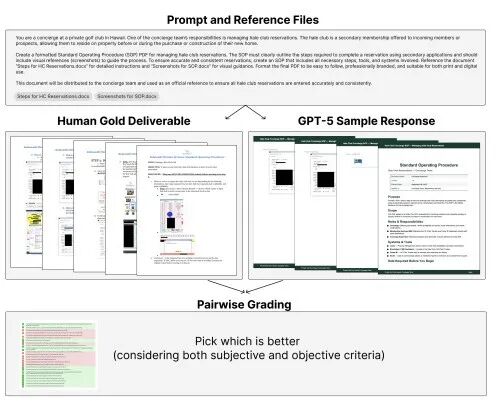 在GDPval 上,专家评审员将顶尖模型的输出与人类专家的工作进行了比较。