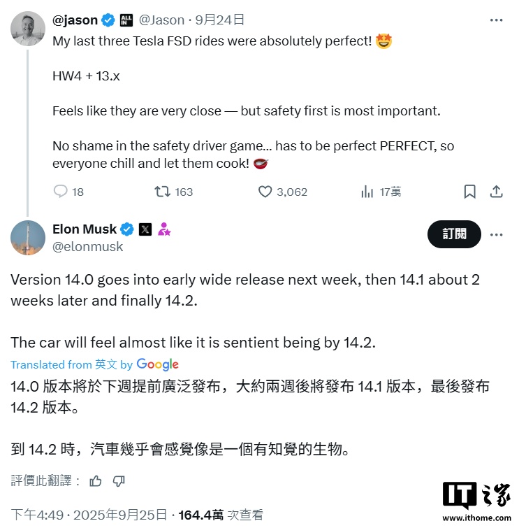 IT之家 9 月 26 日消息,特斯拉 CEO 埃隆・马斯克在 X 平台证实,FSD V14.0 将在下周推送,相比原定的时间晚一个月。