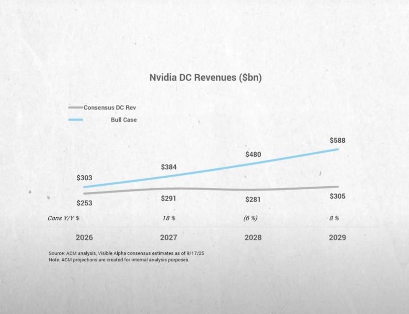 Brad Gerstner:这儿有件事我觉得颇为神秘。你刚提到Oracle 3000亿、Colossus的建设,我们知道一些主权国家在建(AI基础设施),hyperscaler也在建。Sam正以万亿美元的口吻来谈这一切。可覆盖你们股票的华尔街25位卖方分析师的共识却显示,你们从2027年开始增长放缓,预2027-2030年年化增速8%。这些人的唯一工作就是给英伟达做增长预测。显然……