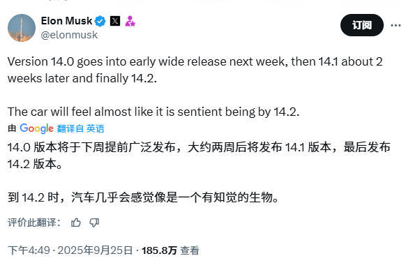 凤凰网科技讯 9月27日,特斯拉CEO埃隆·马斯克于近日通过其社交媒体平台X,公布了备受瞩目的FSD V14版本的详细推送计划。根据计划,特斯拉最快将于下周启动首个版本的部署,随后将依次推出V14.1和V14.2两个后续版本,以阶梯式更新的方式向用户交付这一重大升级。