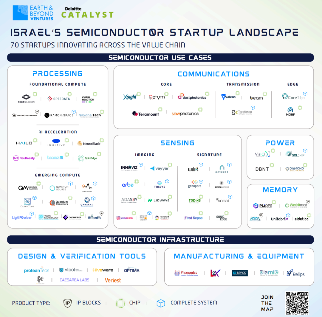 在这张图中,展示了 70 家在不同半导体环节创新的以色列初创企业,涵盖处理器(Processing)、通信(Communications)、传感器(Sensing)、电源(Power)、存储(Memory)、设计与验证工具(Design & Verification Tools)、制造与设备(Manufacturing & Equipment) 等多个领域。