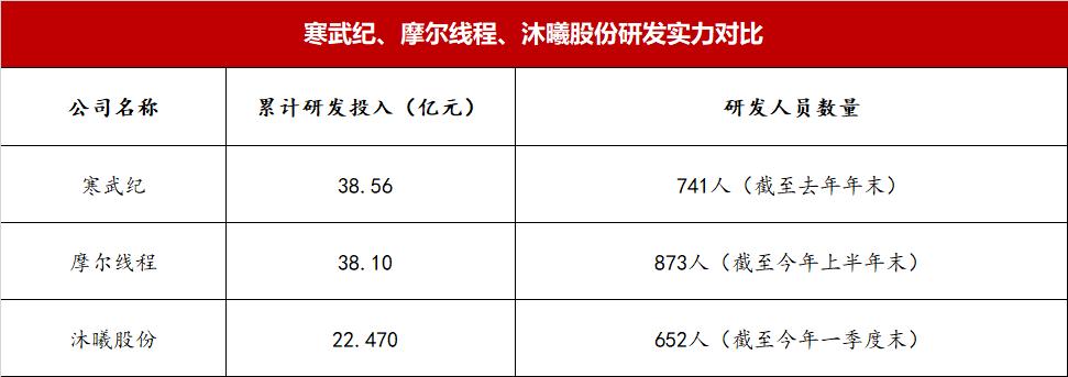 寒武纪(截至去年年末)拥有研发人员741人,摩尔线程(截至今年上半年末)拥有研发人员873人;沐曦股份(截至今年一季度末)拥有研发人员652人。