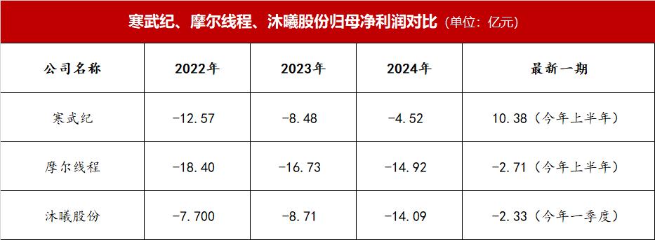 利润方面,寒武纪率先实现扭亏为盈,而摩尔线程和沐曦股份尚在亏损线,但亏损有所收窄。