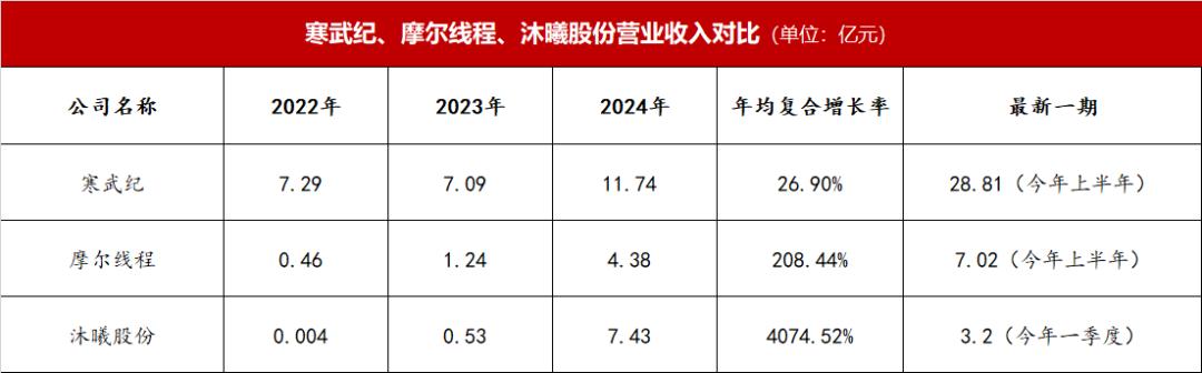 从营收体量来看,寒武纪领先一个身位,摩尔线程原本落后于沐曦股份,但在今年上半年后来居上。由于英伟达产品在国内受限,寒武纪和沐曦股份在上半年业绩都实现爆发式增长,超越过去三年总和,但沐曦股份分到“红利”似乎有限。