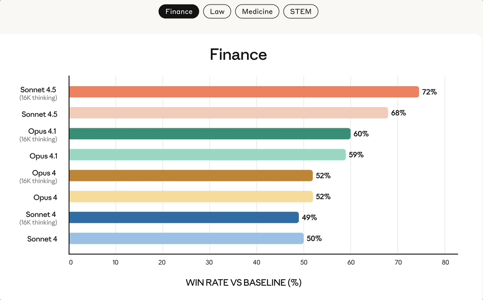 来自金融、法律、医学和STEM领域的专家发现,与包括Opus 4.1在内的旧模型相比,Sonnet 4.5在特定领域的知识和推理能力上表现出了显著的提升
