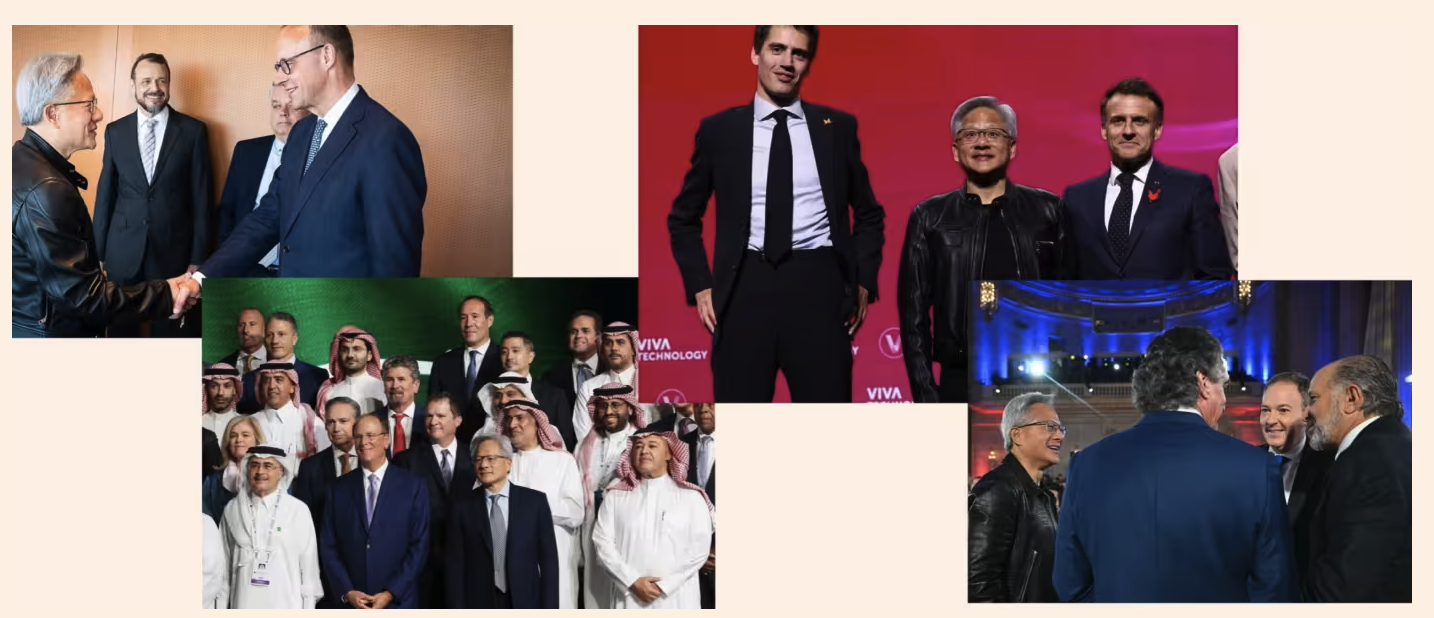过去12个月里,黄仁勋已公开会晤至少12位国家元首及政府首脑,为英伟达的海外利益积极游说。幕后接触更是频密,英伟达高层每月都与各国政府官员举行多轮会谈。