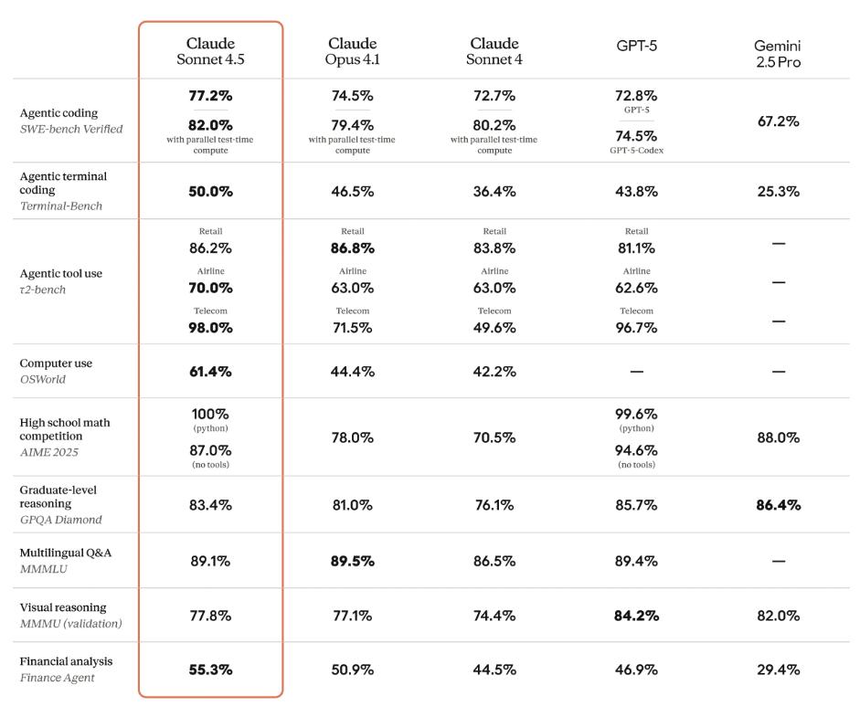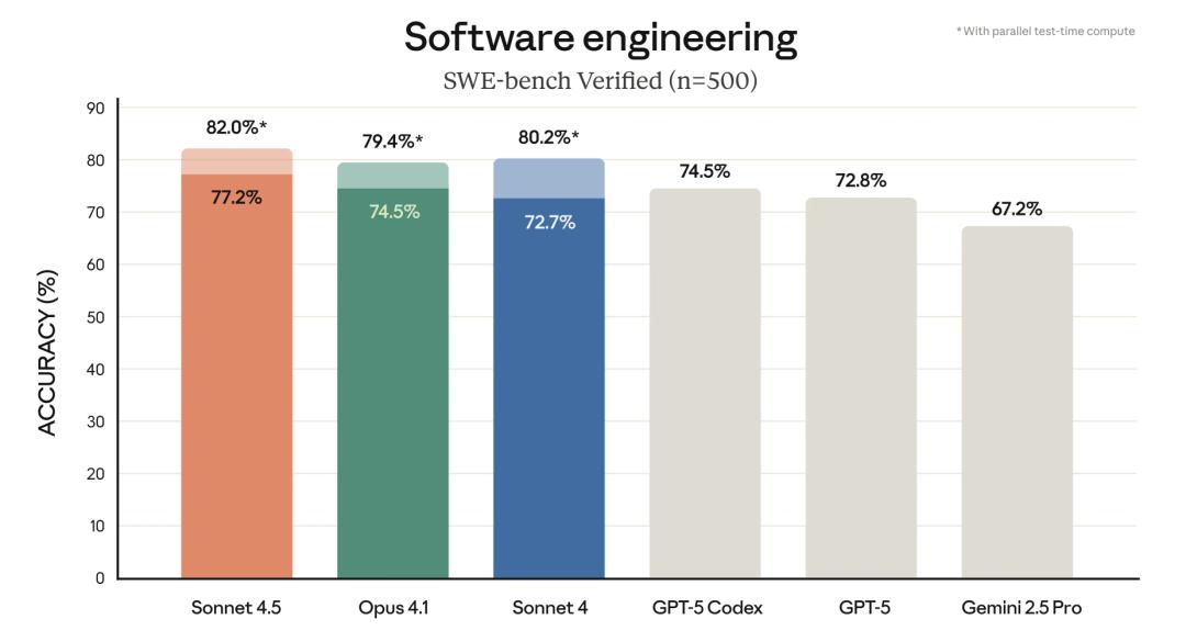 根据官方测试结果显示,Claude Sonnet 4.5 在 SWE-bench Verified 评测里拿下了顶级成绩,这个测试主要看模型在真实世界里写代码的水平。