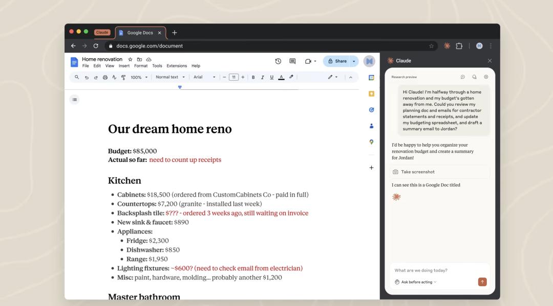 现在这些升级过的能力已经整合进 Claude 的 Chrome 插件,根据官方演示,可以看到这个大模型能够直接在浏览器里操作:打开网站、填写表格、完成任务等等。