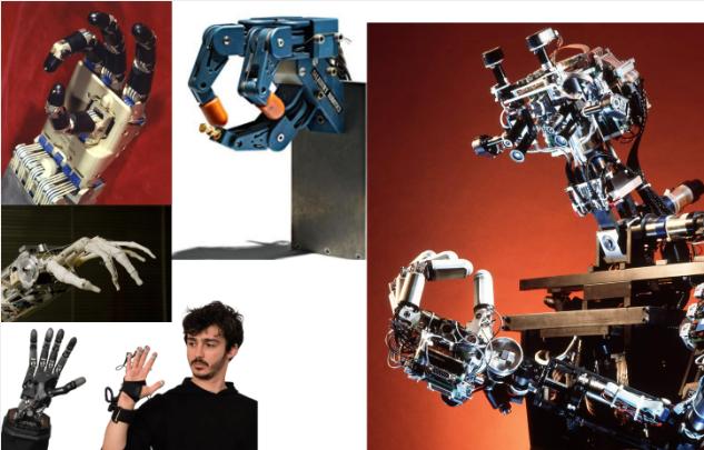 过去几十年间,研究者们研制出了众多模仿人类手部的多关节手指机器人手。下图展示的几款分别由约翰·霍勒巴赫(John Hollerbach)、肯·索尔兹伯里(Ken Salisbury)和松冈洋子(Yoky Matsuoka)研发。