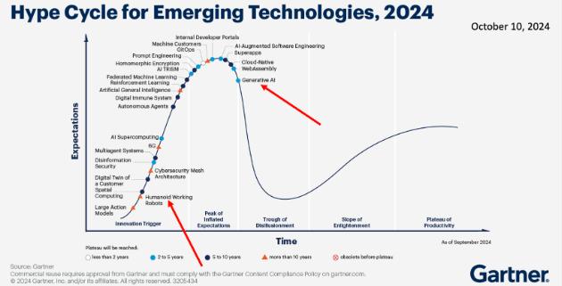 近来,新一代研究者偶然萌生了制造人形机器人的想法,你可能也注意到了相关的一些宣传热度。高德纳(Gartner)表示,目前人形机器人仍处于发展初期,远未达到宣传热度的峰值。下图距今仅一年,从中可看出,人形机器人正处于发展周期的起点,而生成式人工智能已过峰值,正朝着低谷期回落:
