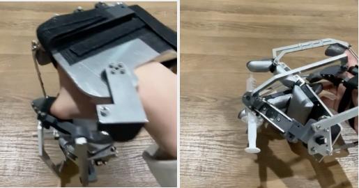 如下图所示,实验者需将手伸入一只手套,手套上固定连接着一个机器人手——机器人手与人类手部相距约10厘米,且完全平行。实验者通过活动自己的手指来控制机器人手的手指,通过移动自己的手臂来调整机器人手与待操控物体的接触位置。