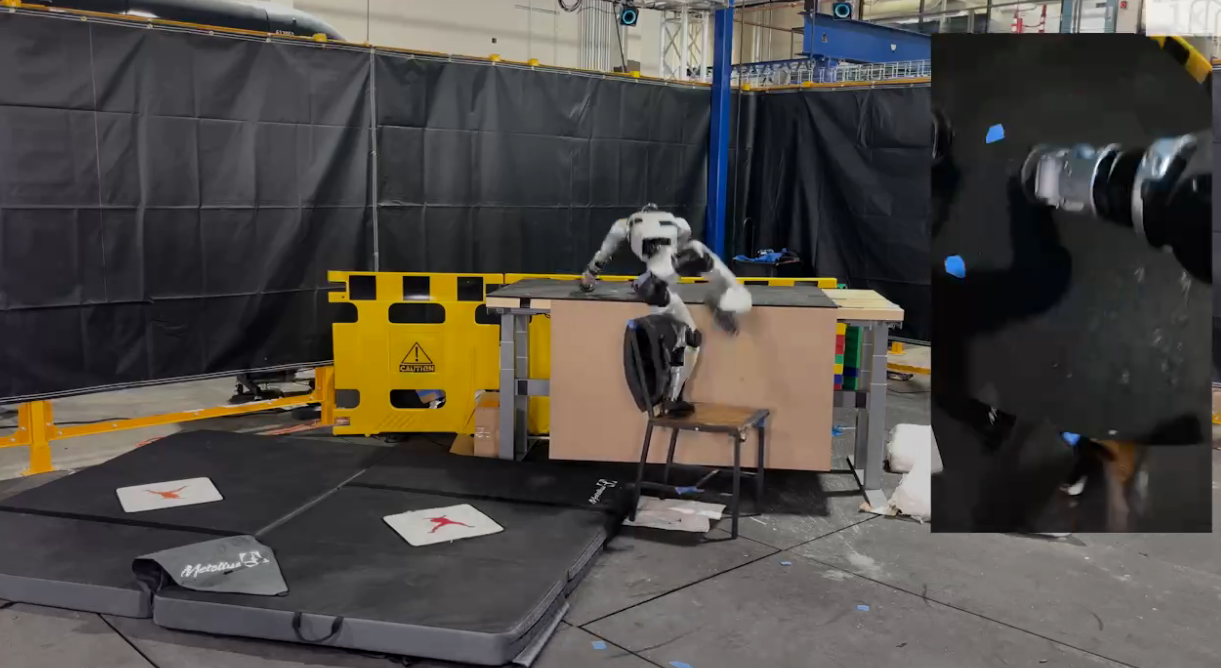 在一个任务中,宇树 G1 机器人携带一把椅子到桌子旁,将其作为踏板爬上去,然后跳下并执行类似跑酷的翻滚动作来缓冲落地。