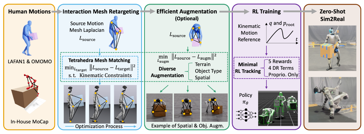 OmniRetarget 是一个基于交互网格的交互保留数据生成引擎,它明确建模并保留了智能体、地形和被操作物体之间关键的空间和接触关系。通过最小化人类和机器人网格之间的拉普拉斯变形,同时强制执行运动学约束,OmniRetarget 生成了运动学上可行的轨迹。
