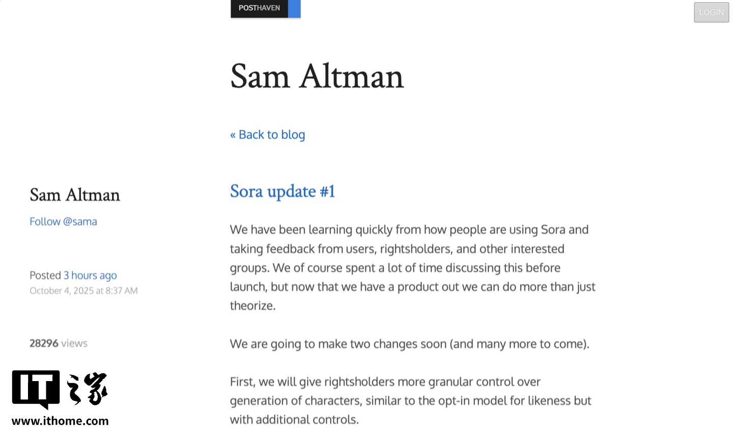OpenAI CEO 奥尔特曼在博客中表示,OpenAI 将赋予权利方“更精细的角色生成控制”,同时电视和电影公司等版权方将能够选择屏蔽其角色在平台上的使用。
