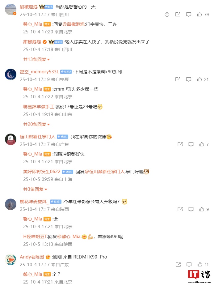 IT之家注意到,胡馨心还在微博评论区与网友展开了互动:有用户询问“下周是不是爆料 K90 系列?”,她回复称“emm 可以 多少爆一些”;另有用户询问“今年红米影像会有大升级吗?”,她表示“会”。