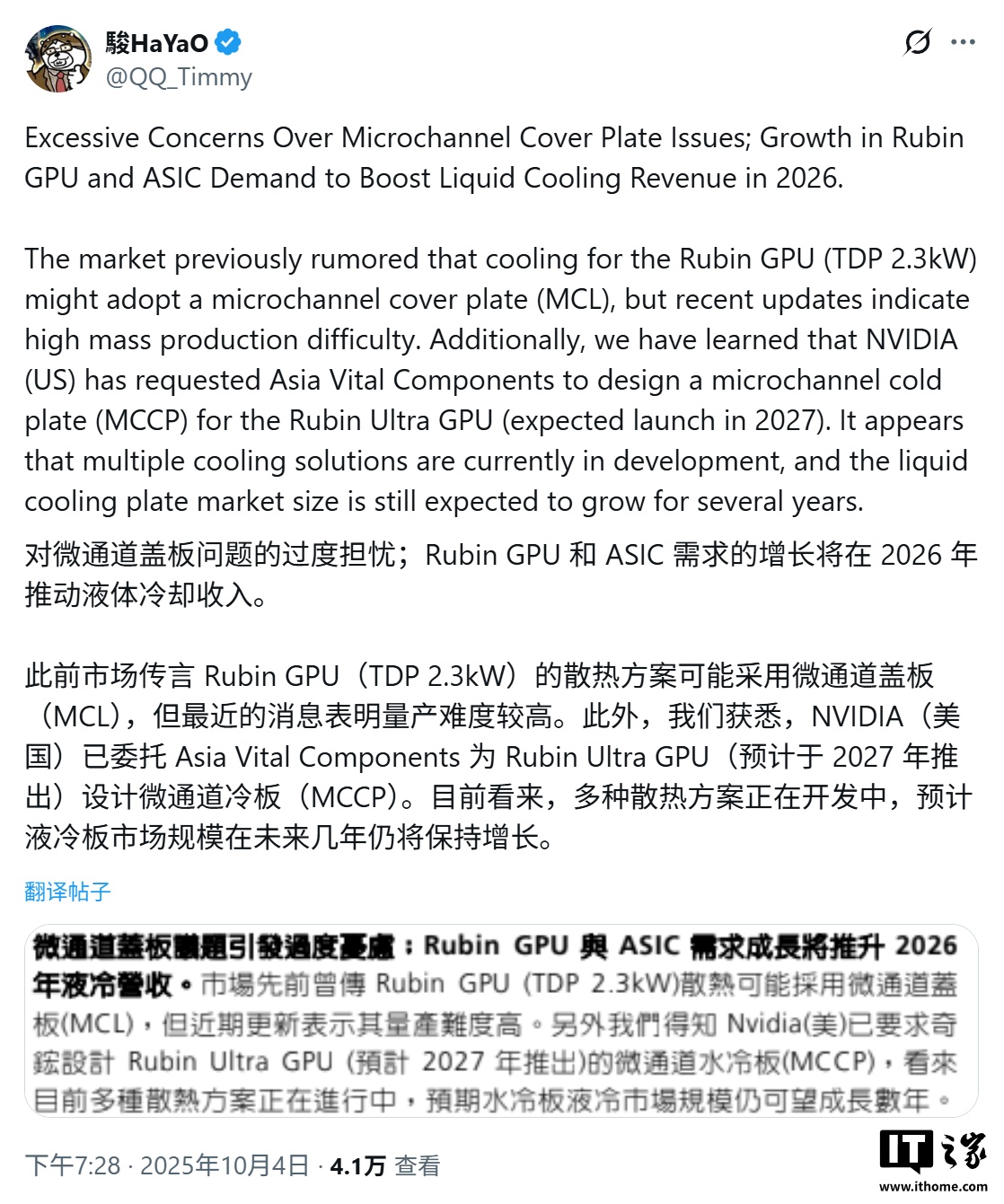 IT之家 10 月 6 日消息,科技媒体 Wccftech 昨日(10 月 5 日)发布博文,报道称英伟达为应对下一代 AI GPU 日益增长的功耗与散热挑战,正计划为其 Rubin Ultra 产品线引入全新的“微通道冷板”(MCCP)散热技术。