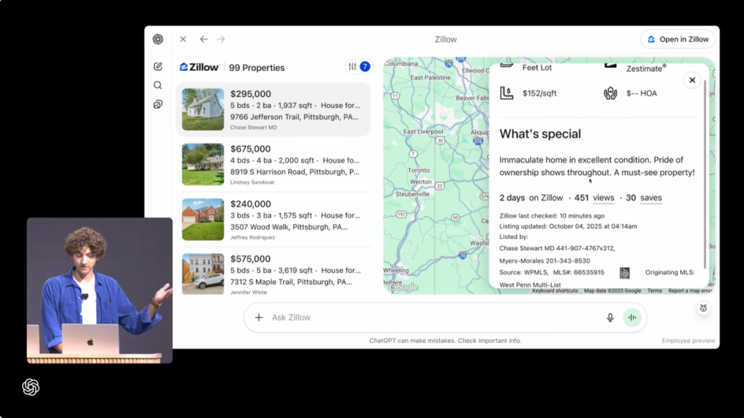 接着,他又通过 ChatGPT 调用了 Zillow,让它展示匹兹堡地区的待售房屋。Zillow 瞬间生成了一张可交互地图,用户还能进一步提问了解更多细节。