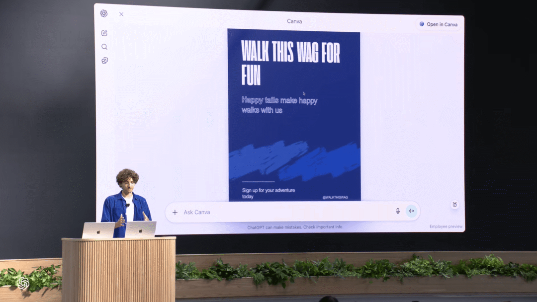 OpenAI 员工打开 ChatGPT,直接让 Canva 给一家遛狗服务公司设计宣传海报。几秒钟后,Canva 就给出了好几种设计方案。