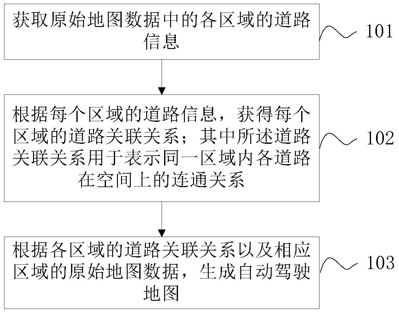 本实施例提供的自动驾驶地图的生成方法、自动驾驶方法及相关产品,通过获取原始地图数据中的各区域的道路信息;根据每个区域的道路信息,获得每个区域的道路关联关系;其中所述道路关联关系用于表示同一区域内各道路在空间上的连通关系;根据各区域的道路关联关系以及相应区域的原始地图数据,生成自动驾驶地图。利用该自动驾驶地图,自动驾驶车辆可获得自动驾驶地图中的道路关联关系,并根据地图表现的各道路在空间上的连通关系确定周围环境车所在道路与车辆所在道路之间的关系,从而对环境车的行驶轨迹是否会对与车辆行驶产生影响进行判定,提高自动驾驶车辆对环境车的行驶轨迹预测的准确性。