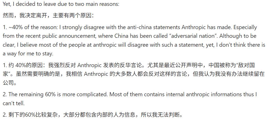 而他此次之所以选择离开 Anthropic,主要有两个方面的原因: