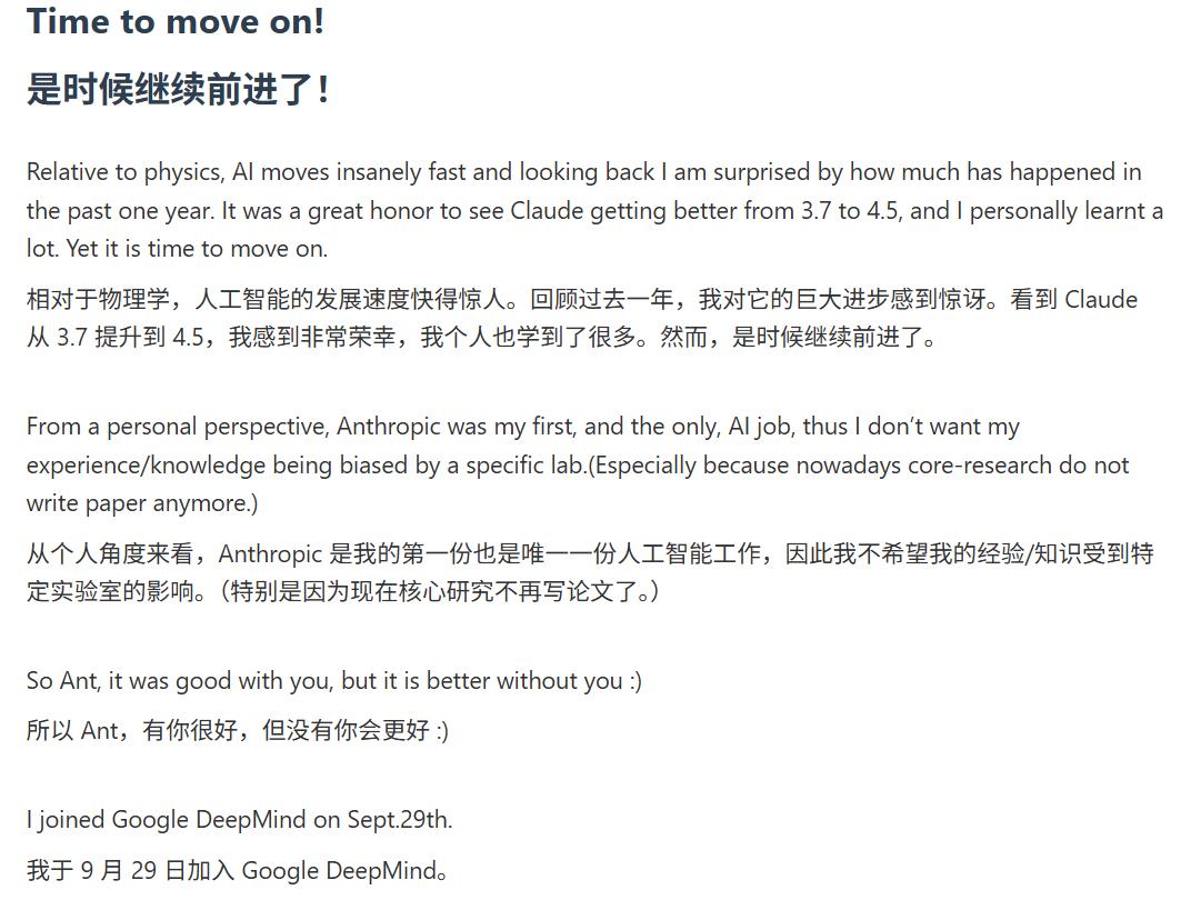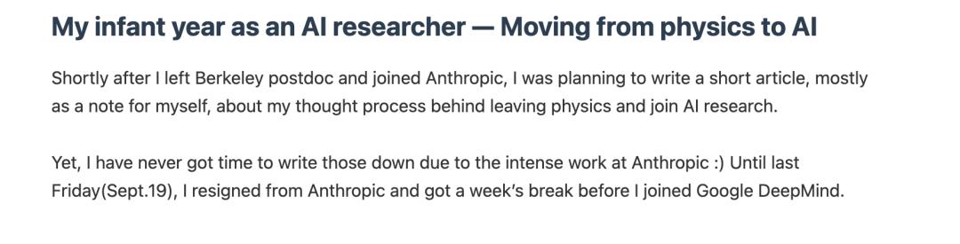 而在他看来,Anthropic 是物理学家(或许也包括其他 STEM 背景的博士)开启 AI 研究之旅的最佳平台之一。值得注意的是,在 Anthropic 期间,他参与将 Claude 从 3.7 提升到 4.5,AI 惊人的发展速度让他惊讶,自己也学到了很多,「然而,是时候继续前进了。」