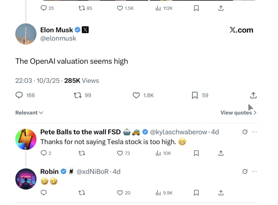 虽然“估值最高”只是一个虚名,而且随时可能变化,但对明争暗斗的奥特曼与马斯克来说,双方都不会放过打击对手好胜心的机会。马斯克随后在X平台上公开嘲讽说,“OpenAI的估值有些偏高。”马斯克的xAI正在融资,估值有望达到2000亿美元。