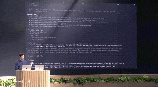 现场演示里,一个工程师只说一句“给我弄一个控制舞台灯光和摄像头的界面”,Codex 一下把前端 UI 搭起来、后台服务写好,还去 GitHub 找协议文档,甚至管理手柄控制、语音指令,都整合进去了。