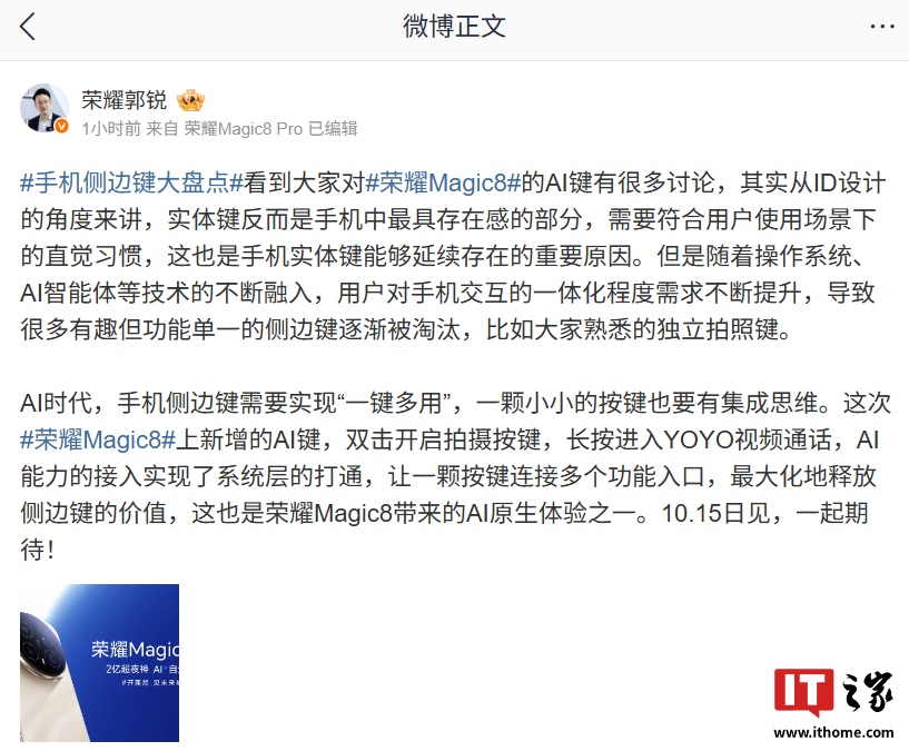 IT之家 10 月 9 日消息,荣耀终端股份有限公司品牌营销总裁、集团首席营销官郭锐今日发文介绍了荣耀 Magic8 系列手机的 AI 键。他表示,从 ID 设计的角度来讲,实体键反而是手机中最具存在感的部分,需要符合用户使用场景下的直觉习惯,这也是手机实体键能够延续存在的重要原因。