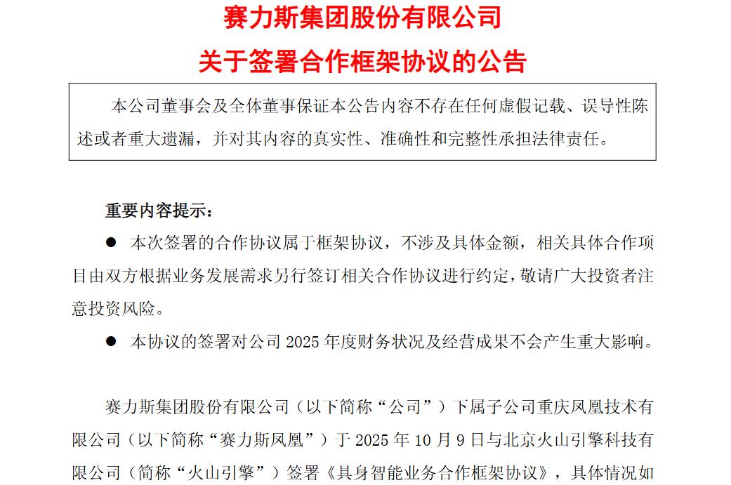 不过呢,这次签署的还只是一个框架性协议,等同于意向书,目前还没有披露更多细节。赛力斯也明确了,协议不会对2025年财务业绩造成什么重大影响。