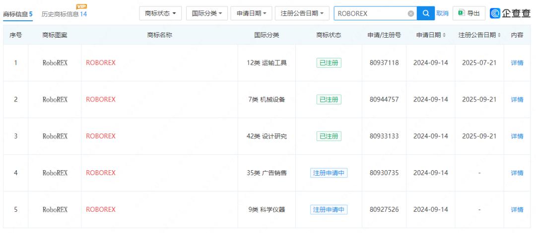 2024年9月,赛力斯申请了“ROBOREX”商标,不久前已获国家知识产权局核准注册。当时外界普遍推测,这很可能就是赛力斯机器人产品的潜在品牌。