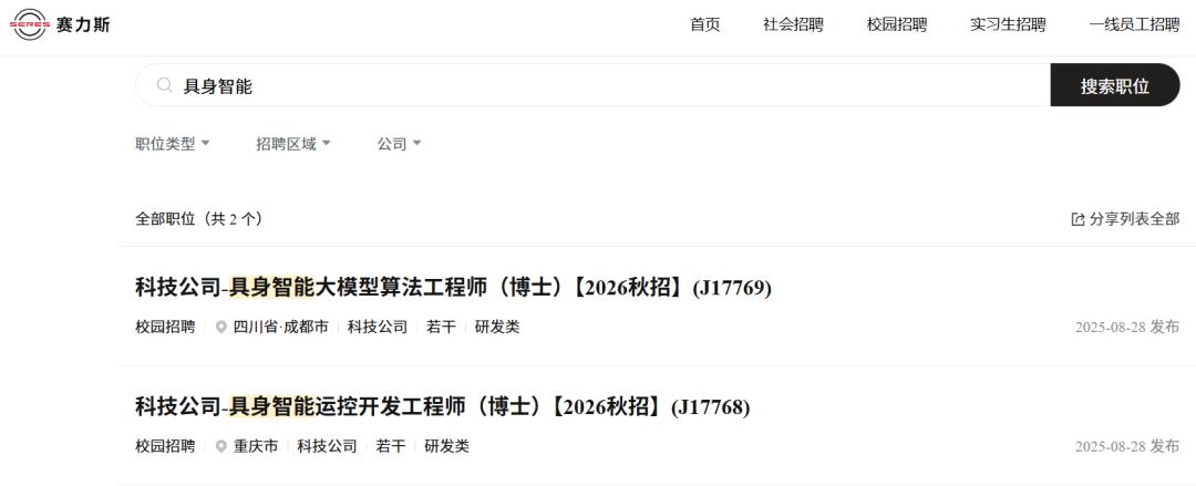 比如今年的春季校招,赛力斯首次设立了“具身智能大模型工程师”岗位;秋季校招还有“具身智能大模型算法工程师”等岗位,现在还能在其招聘官网中看到。