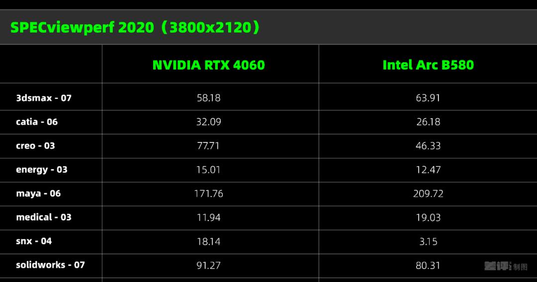 专业跑分环节我们也测了,依旧是祖传的 SPECviewperf 2020 全家桶八件套,其中 4060 以 5:3 的比分战胜了 B580 。