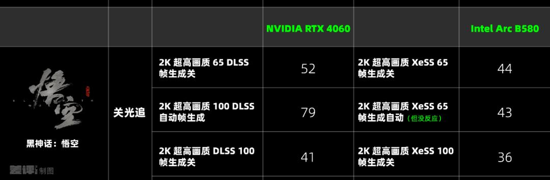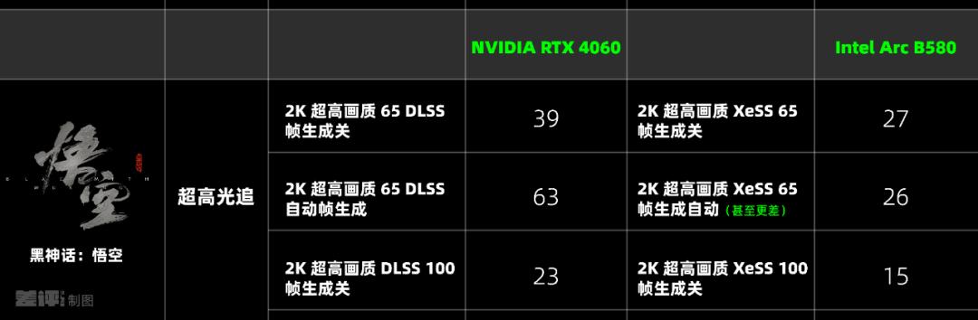 而另一款游戏 《黑神话:悟空》 的测试结果却完全相反,4060 以一个非常标准的结局战胜了 B580 。