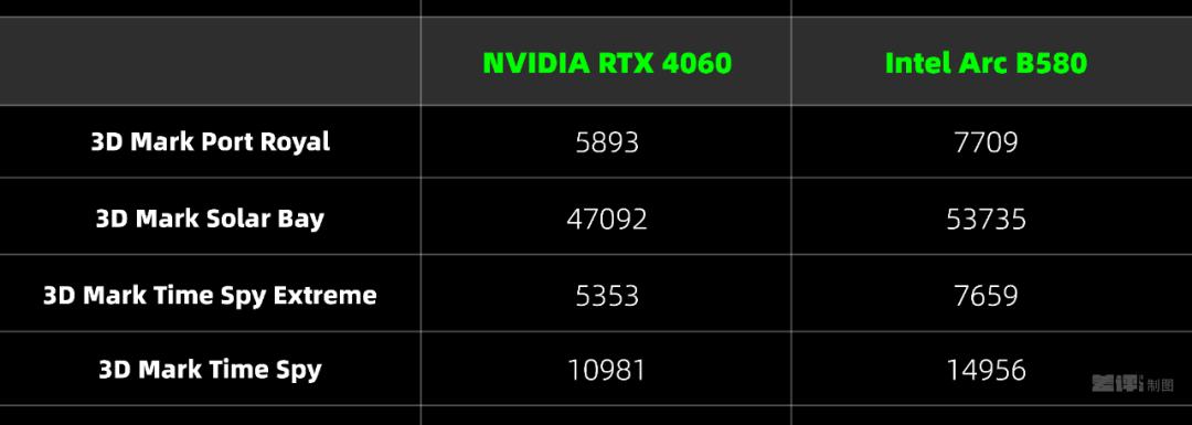 结果您猜怎么着,在我们测试的 4 项 3D Mark 跑分中, B580 全都跑赢了 4060 !