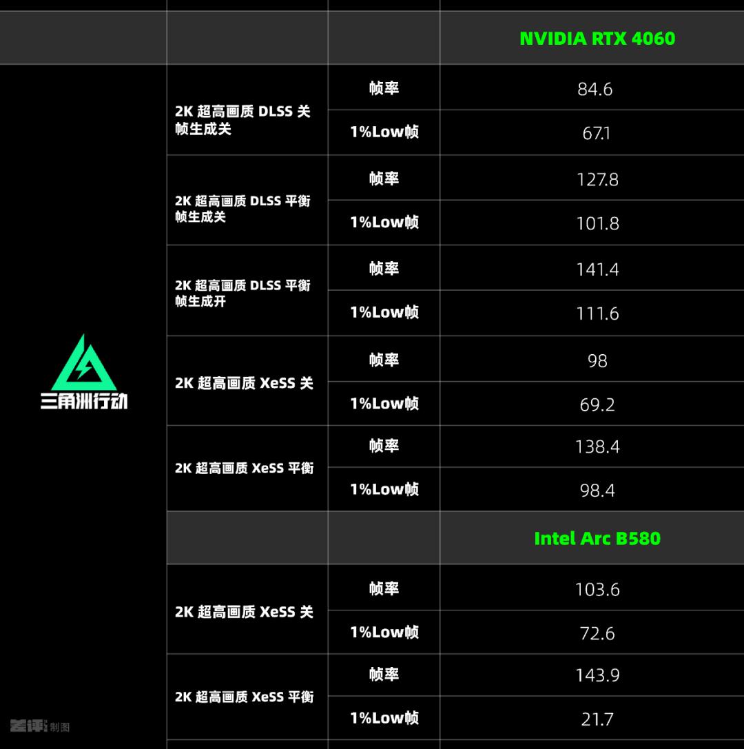 《三角洲行动》就比较有意思了,尽管 B580 只能开启 XeSS 而没有帧生成,但帧率还是比 4060 高一些。
