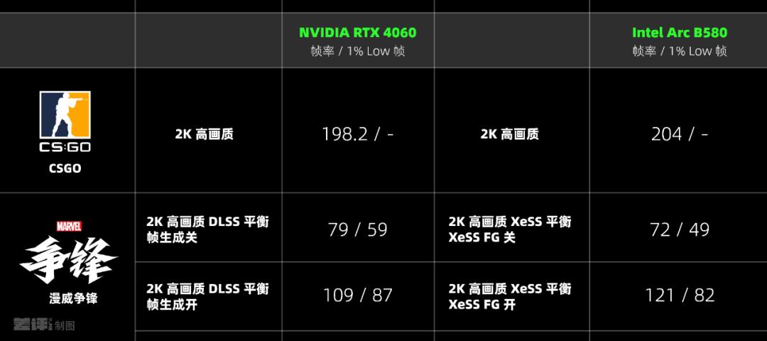 而《漫威争锋》不开帧生成的话,4060 帧率稍高,开启帧生成之后则是 B580 略胜一筹。