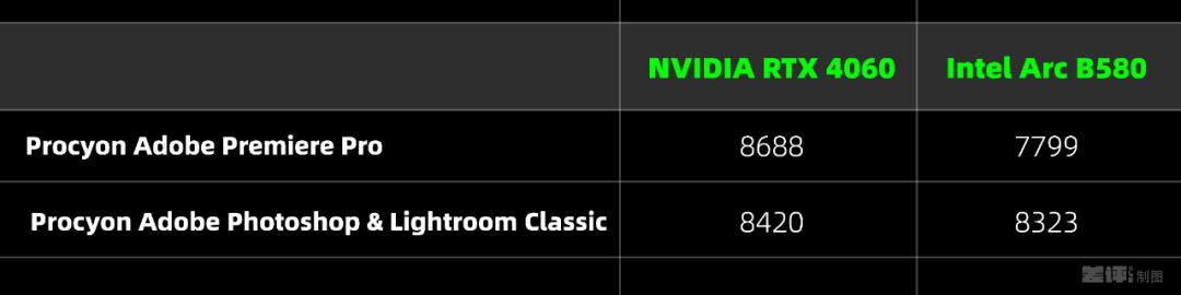 图形生产力方面是英伟达的传统优势项目了,公司的后期们基本人手一块 N 卡,这方面确实没啥毛病可挑,不过 B580 的分数也没有落后很多。