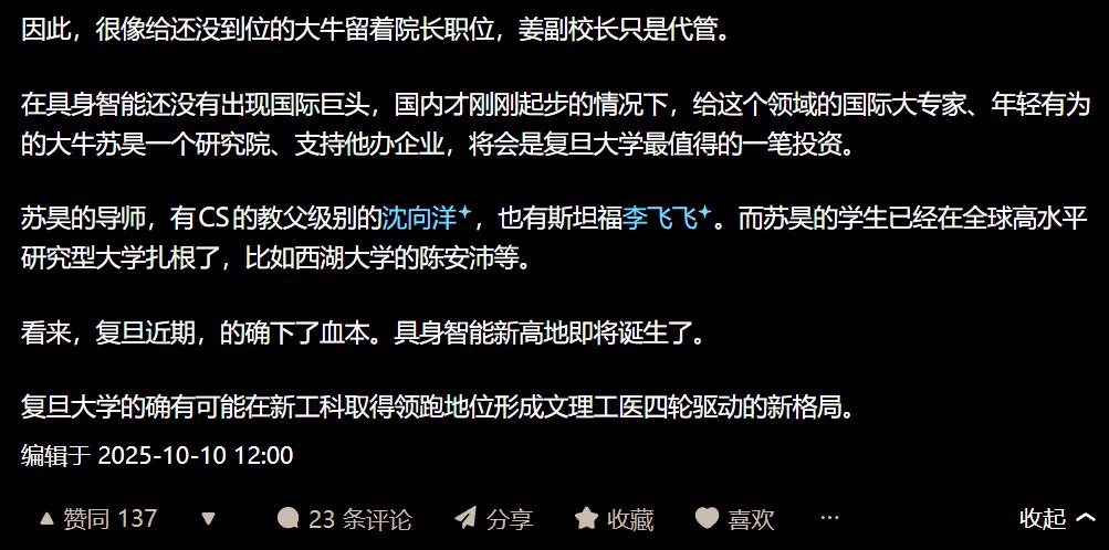 如果复旦将苏昊及其团队纳入,在这个领域形成「定海神针」级别核心力量,并与已有计算机视觉、自动化、材料、工程背景交叉融合,能快速构建国内在具身智能方向的核心竞争力。