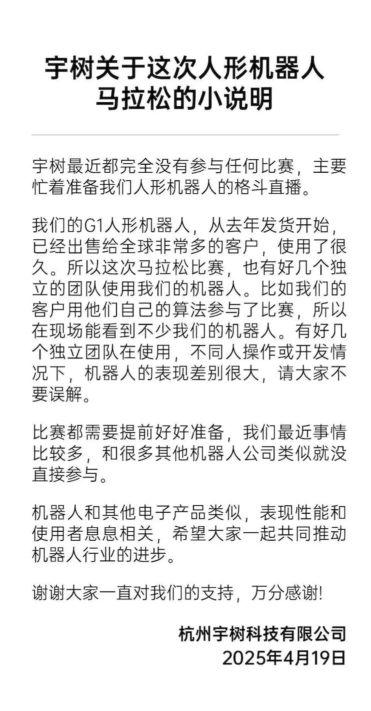 宇树科技后续的动作,也在默默回应外界质疑:从拳击赛事的技术展示,到2025世界人形机器人运动会的登场,宇树逐渐找回了“该有的样子”。尤其在运动会海报上,宇树特意标注“另有其他选手使用宇树机器人参赛”,显然是吸取了半马的教训,提前厘清身份边界,避免再次引发误解。