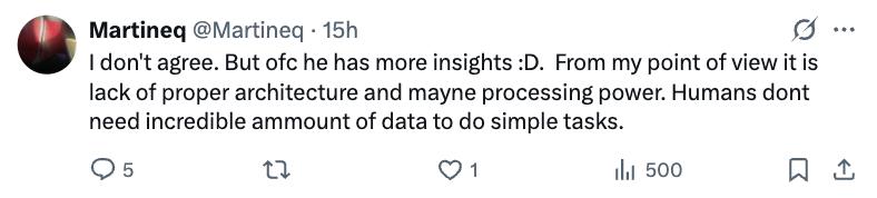 我不同意。不过他当然更有见地。在我看来,问题在于缺乏合理的架构和算力。人类执行简单任务并不需要海量数据。