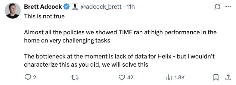 我们向《时代周刊》演示的绝大多数操作策略,在家庭场景下处理极具挑战的任务时,都实现了高性能运行。目前的瓶颈确实在于Helix缺乏数据,但我不会像您那样描述这个问题,我们必将解决它。