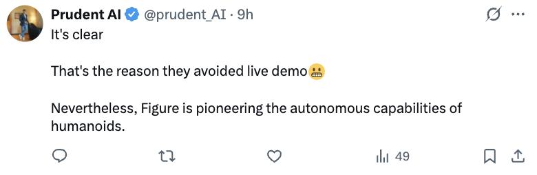 显而易见,这正是他们回避进行现场演示的原因。但无可否认,Figure在人形机器人的自主能力上正进行着开创性的工作。