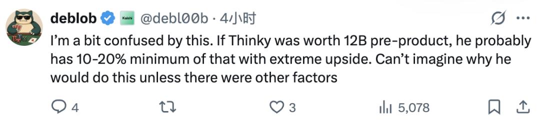 但对于Tulloch的离职,还是有网友感到不解,表示如果Thinking Machines Lab估值是120亿美元,Tulloch起码能拿到10%,实在是想象不到他的离职理由。