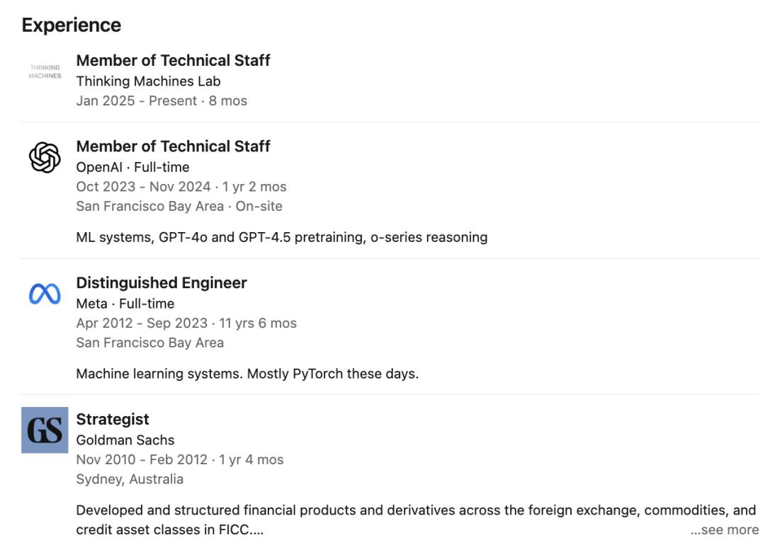 在此之前,他曾在Meta干了11年;随后2023年加入OpenAI,重点参与了GPT-4o、GPT-4.5预训练,o系列推理的研发。