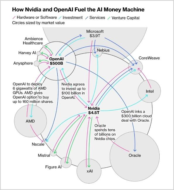 英伟达斥资千亿美元投资OpenAI布局AI系统,OpenAI转而将千亿美元投入甲骨文购买云计算服务,甲骨文又转身向英伟达采购千亿美元芯片。