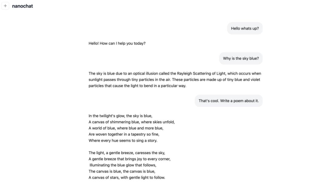 使用 WebUI 与价值 100 美元、耗时 4 小时的 nanochat 进行的示例对话。