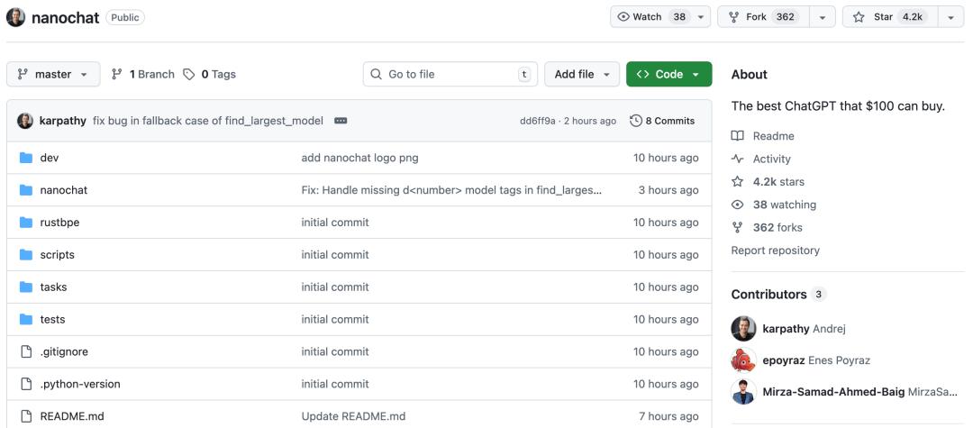 整个系统仅约8000行干净代码,启动一台GPU机器、运行一条脚本,4小时后你就能在网页界面与自己训练的「小ChatGPT」对话。