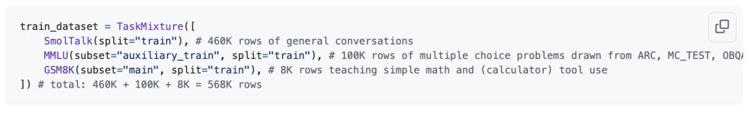 在SmolTalk用户-助手对话数据集、多项选择题数据集、工具使用数据集上进行中期训练 (Midtrain)